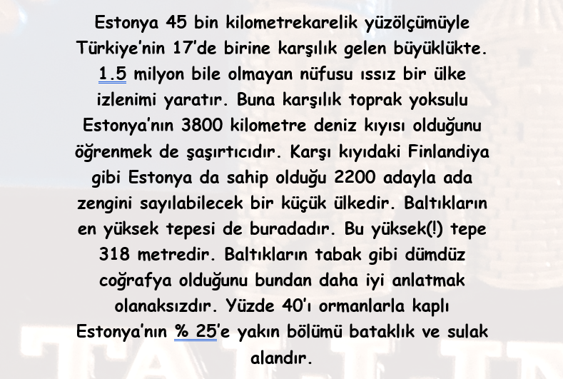 İki saatlik keyifli bir Baltık yolculuğunun sonunda kendimizi Tallinn rıhtımında bulduk. Farklı bir ülkeye gelmiş olmamıza karşın pasaport denetimi bile yapılmamış olmasına şaşırdık. Estonya’nın bu yolla parasal kazanç sağladığını düşününce Türkiye’nin yabancı gezginlere kapıları ardına dek açmış olmasına benzer bir durumla karşı karşıya olduğumuzu anlamamız güç olmadı.