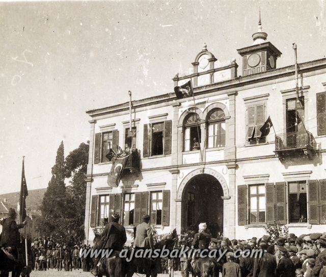 Binanın piramidal çatısında bulunan cihannüma şeklinde kare planlı saat kulesi Bergama’nın tek saat kulesidir. Ahşap kulenin dört cephesinde de Roma rakamlı dairesel saat kadranları yer alıyor. Dalgalı parametli düz çatısının üzerinde soğanbaşı olarak tabir edilen kurşun kaplama kubbesiyle örtülü saat kulesinin en üst bölümü üç kısımlı zarif bir alemle son bulmaktadır.
