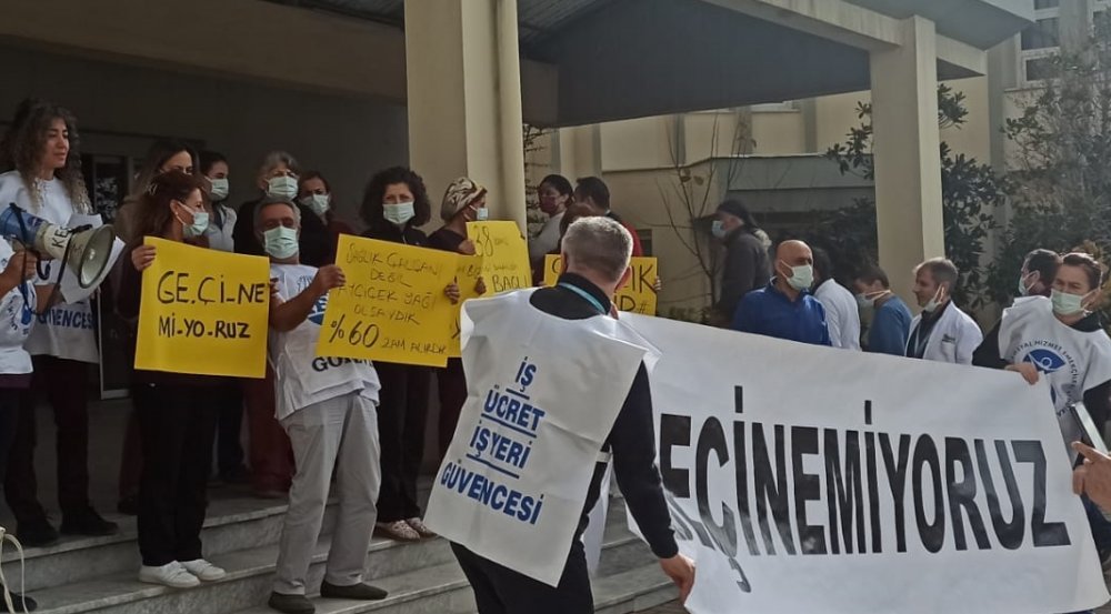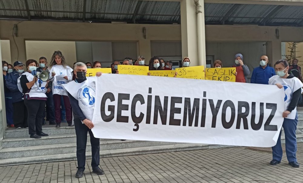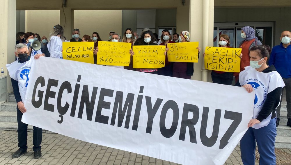 Bergama Necla-Mithat Öztüre Devlet Hastanesi önünde yapılan basın açıklamasında “Geçinemiyoruz” yazılı pankart ile “Sağlık ekip işidir”, “Göz boyamak için biz kalem kullanıyoruz siz medya”, “Sağlık çalışanı değil, Ayçiçek yağı olsaydık %60 zam alacaktık” ve “38 branş hangi bakanlığa bağlı” yazılı dövizler açıldı.