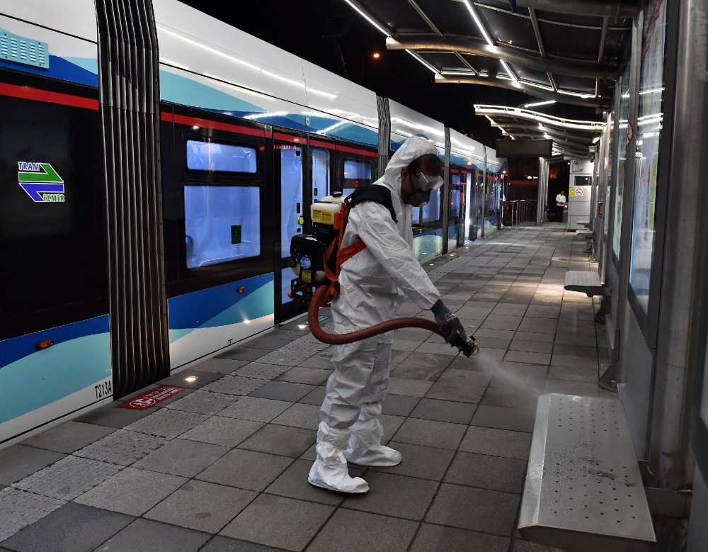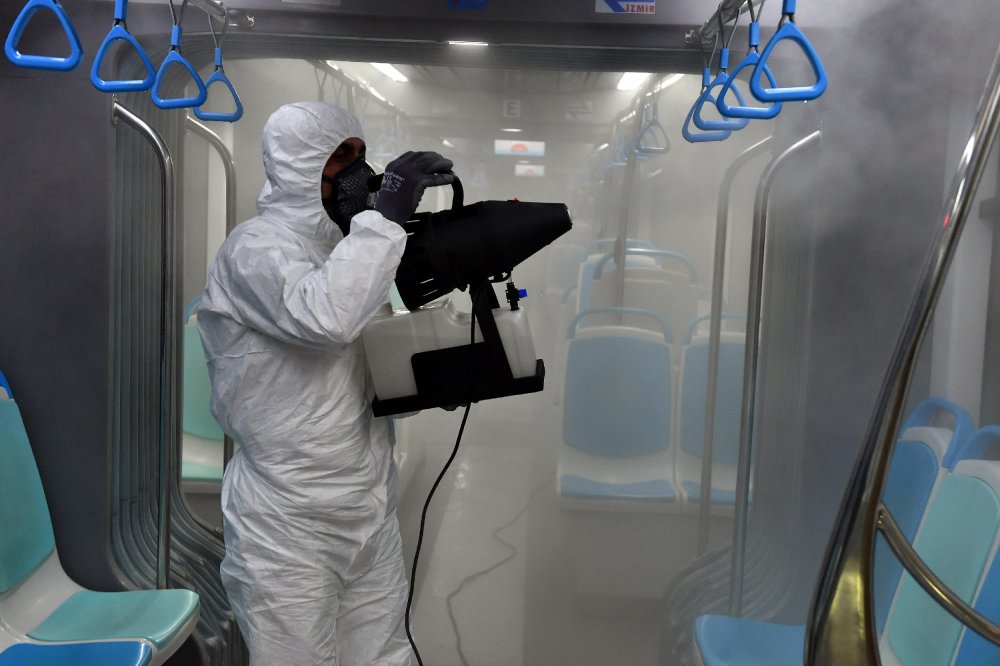 İzmir’de metro, tramvay ve otobüslerde devam eden rutin temizlik faaliyetlerinin yanı sıra virüslere ve bakterilere karşı dezenfeksiyon çalışması da başlatıldı. İzmir Büyükşehir Belediyesi Çevre Koruma ve Kontrol Şube Müdürlüğü ekiplerince ilk etapta 182 metro aracı ve 38 tramvay aracından oluşan 220 araçlık filoda temizlik çalışmaları sonrası ilaçlama yapıldı. Aynı çalışma, metro istasyonlarında ve tramvay duraklarında da yapıldı.