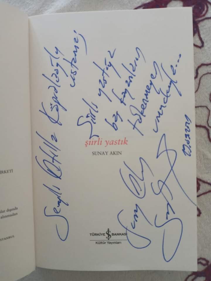 Kendini “araştırmacı şair” olarak tanıtan Sunay Akın, kapağını “ay yıldızlı gökyüzü ve milli mücadele yıllarını anımsatan” fotoğrafla süslediği yeni kitabının ismini, Mustafa Kemal Paşa'ya ayrılan odada yastık kılıflarına işlenmiş bu şiirden esinlenmiş, 'Şiirli Yastık' olarak seçmiş.