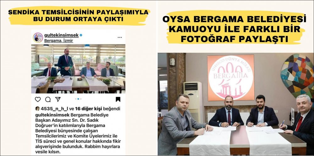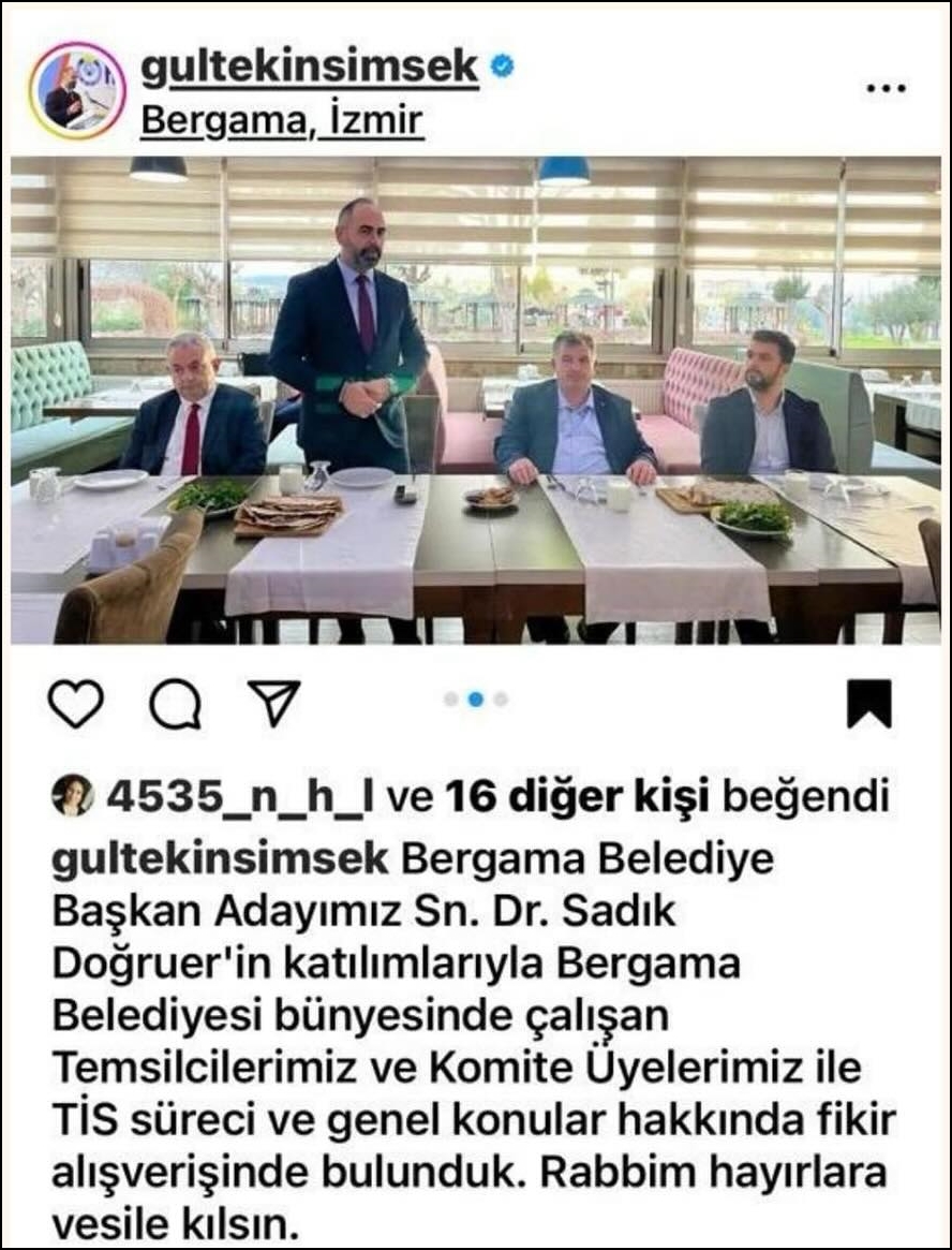 Hak - İş Konfederasyonu İzmir İl Başkanı ve Hizmet - İş Sendikası İzmir Şube Başkanı Gültekin Şimşek tarafından paylaşılan fotoğrafın altına ise; “Bergama Belediye Başkan Adayımız Sayın Dr.Sadık Doğruer’in katılımıyla, Bergama Belediyesi bünyesinde çalışan temsilcilerimiz ve komite üyelerimiz ile TİS süreci ve genel konular hakkında fikir alışverişinde bulunduk” sözlerini kullandı.