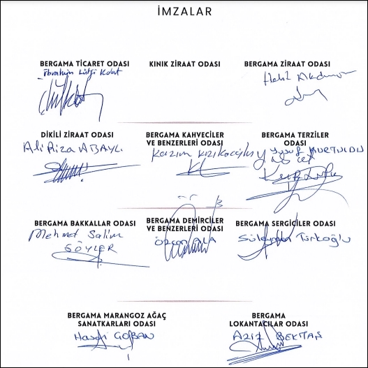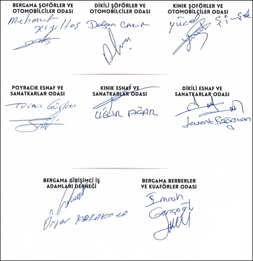 Bergama Ticaret Odası Başkanı (BERTO) Lütfi Kolat, Bakkallar Odası Başkanı Mehmet Salim Söyler, Ziraat Odası Başkanı Nuri Taşkıranoğulları, Terziler Odası Başkanı Yusuf Kurtuldu, Demirciler Odası Başkanı Özcan Ala, Şoförler ve Otomobilciler Odası Başkanı Mehmet Kızıltaş, Sergiciler Odası Başkanı Süleyman Türkoğlu, Marangozlar Odası Başkanı Hasan Çoban, Lokantacılar Odası Başkanı Mustafa Kemal Bayraktarlar, Berberler Odası Başkanı Emrah Gençoğlu, Kahveciler Odası’nı temsilen yönetim kurulu üyesi Adnan Ergöçmen; Cumhuriyet Halk Partisi (CHP) İlçe Başkan Yardımcısı İsmail Durmaz ve Bergama’nın önceki dönem belediye başkanı ve İzmir 2.Bölge CHP Milletvekili Aday Adayı Mehmet Gönenç ile bir araya geldi.
