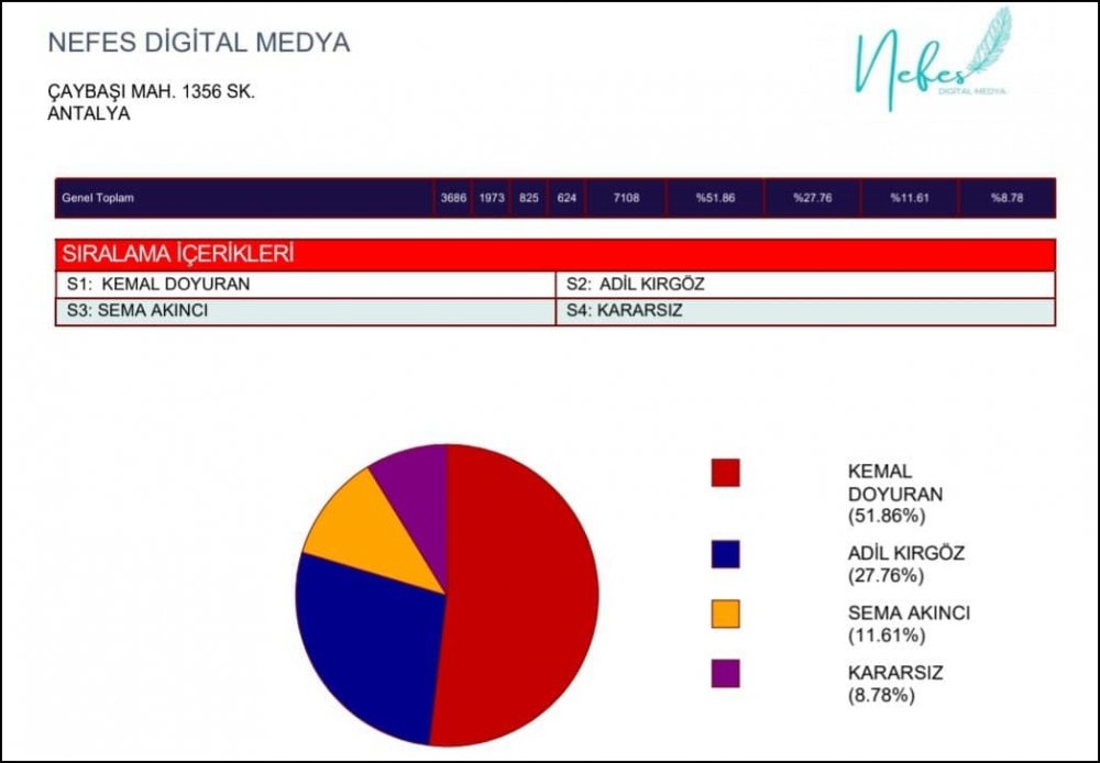Daha önce Kırmızı Kare şirketi tarafından yapılan sesli ankete 6 bin 37 kişi katılmıştı. Bu anket sonuçlarına göre, bağımsız aday Kemal Doyuran birinci sırada yer almıştı. (Kemal Doyuran yüzde 40.3 ile 2250 kişi, Adil Kırgöz ise 34.8 ile 1940 kişi)