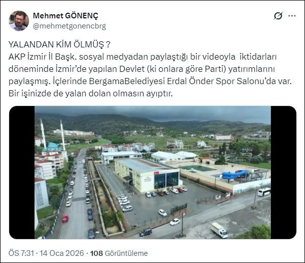 Paylaşıma "Yalandan kim öldü" liderliği ile tepki gösteren Başkan Gönenç; “ AKP İzmir İl Başkanı sosyal medyadan paylaştığı bir videoyla iktidarları döneminde İzmir'de yapılan Devlet (ki onlara göre Parti) yatırımlarını paylaşmış. İçlerinde Bergama Belediyesi Erdal Önder Spor Salonu'nda var. Bir çalışmalardade de yalan dolan olmasın ayıptır” sözlerine yer verdi.