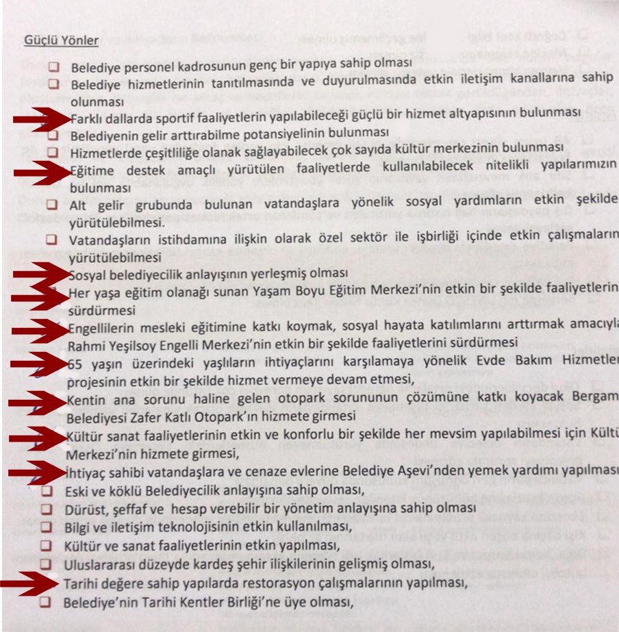 Bergama Belediye Başkanı Hakan Koştu’nun konuşmalarında sık sık hizmet olarak görmediği ve “Hizmetsizlik Dönemi” olarak nitelediği önceki yönetimin gerçekleştirdiği projeler, stratejik planda belediyenin güçlü yanları olarak tanımlandı.