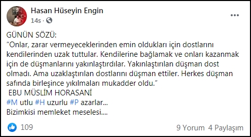 Tüm yaşananların ardından MHP İlçe Başkanı Hasan Hüseyin Engin’in paylaşımı ise AKP’ye mesaj olarak nitelendirilerek, manidar bulundu. Engin paylaşımında, Ebu Müslim Horasani’nin; “Onlar, zarar vermeyeceklerinden emin oldukları için dostlarını kendilerinden uzak tuttular. Kendilerine bağlamak ve onları kazanmak için de düşmanlarını yakınlaştırdılar. Yakınlaştırılan düşman dost olmadı. Ama uzaklaştırılan dostlarını düşman ettiler. Herkes düşman safında birleşince yıkılmaları mukadder oldu” sözlerine yer verdi.