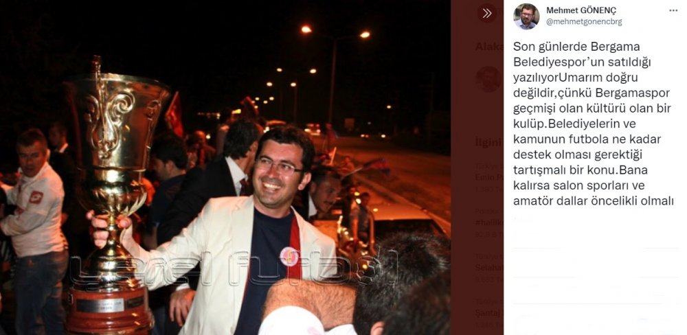 Bergama'nın önceki dönem Belediye Başkanı Mehmet Gönenç devir ile ilgili düşüncelerini sosyal medya üzerinden paylaştığı; "Son günlerde Bergama Belediyespor’un satıldığı yazılıyor. Umarım doğru değildir, çünkü Bergamaspor geçmişi olan, kültürü olan bir kulüp. Belediyelerin ve kamunun futbola ne kadar destek olması gerektiği tartışmalı bir konu. Bana kalırsa salon sporları ve amatör dallar öncelikli olmalı. Ancak herşeye rağmen ortada bir kentle özdeşleşen bir kulüp sözkonusu. 1983’te ilk kez 3. Lig kurulduğunda bu ligin ilklerindendik. Neredeyse 40 yıl olmuş. Önceside var elbette. Süper Amatörden BAL’a oradan da 3.lige çıkışımızı dün gibi anımsıyorum. Hele de Can Güler ‘in Alex golünü. Asfalt olur, yol olur, köprü olur da… Bir gün, bir pazar günü; tamircisi, doktoru, Çırağı, amiri, memuru, terzisi, berberi bir tribünde bir araya gelip 'BERGAMA' diye bağırmaz. Bu manzaradan da bir Malzemeci Turan bir Mopar Yusuf bir Tahsin Süter çıkmaz. Anlayana"