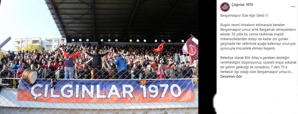 Bergama Çılgınlar 1970 tarafından sosyal medya üzerinden 'Bergamaspor size ağır geldi' başlığı ile yapılan açıklamada; "Bugün resmî imzaların atılmasıyla beraber Bergamaspor’umuz artık Bergamalı olmayanların elinde. 50 yıllık bu camia tarihinde maddi imkansızlıklardan dolayı ne kadar zor günler geçirsede her seferinde ayağa kalkmayı onuruyla gururuyla mücadele etmeyi başardı. Belediye olarak Bilir Altay’a gereken desteğin verilmediğini düşünüyoruz, siyaseti araya sokarak bir şehrin geleceği ile oynadınız. 7 den 70 e herkesin ilgi odağı olan Bergamaspor’umuz bundan 3-5 sene sonra tarih olursa bunun tek sorumlusu sizler olursunuz ve bu şehirde o zaman gereken cevabı verir. Türkiye’de hemen hemen bir çok kulüp belediye desteği ile yoluna devam ederken biz resmiyet kazanmamış bir yasa ile durumu alel aceleye getirip kulübün satışını yaptık. Bu süreçin gerekli alt yapısı oluşturularak uzun vadede Bergamasporun geleceği sağlama alınacak bir proje yapılmalıydı. Bundan sonraki süreç inşallah Bergamaspor’umuz için iyi olur şehrin takımı ismi, arması, renkleri değişmeden maçlarını Bergama’da oynar" denildi.