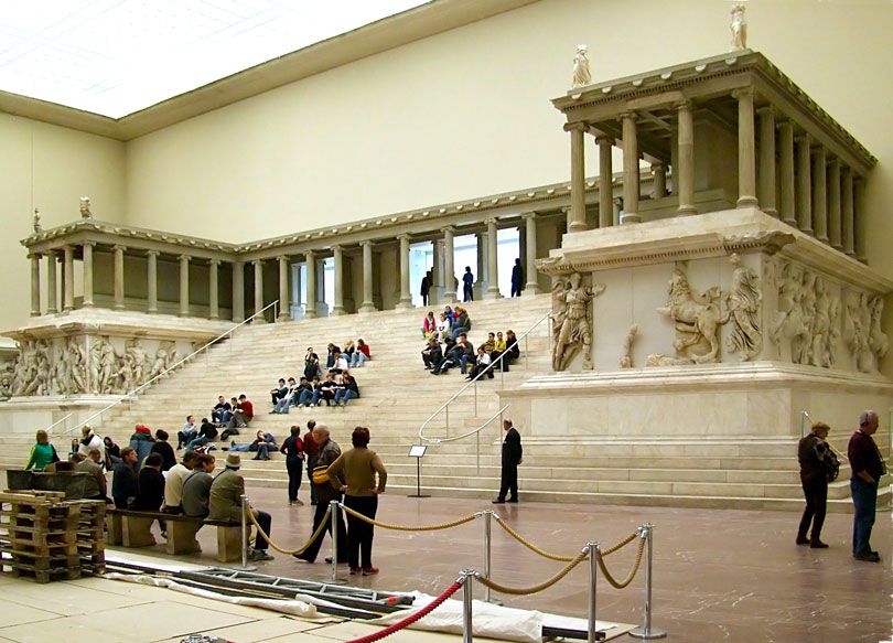 Müze Adası özellikle Bergama Müzesi'nde (Pergamonmuseum) sergilenen dev mimari eserlerle ünlüdür. Bu mimari eserler Alman arkeologların öncülüğünde gerçekleştirilen kazı çalışmaları ile 19. yy sonunda gün yüzüne çıkarılmıştır. Üzerinde dev frizi bulunan Bergama sunağı Bergama'dan, Pazar kapısı ise geç Roma döneminde kurulan Milet şehrinden getirilmiştir.
