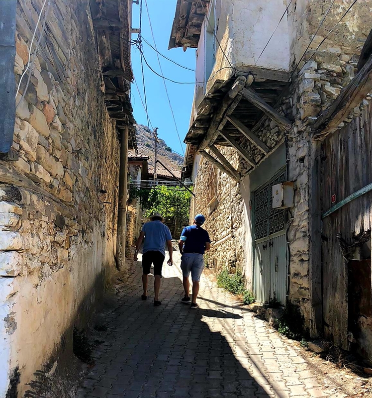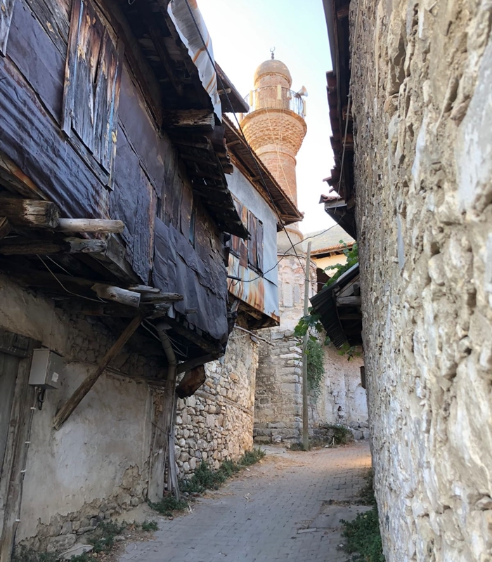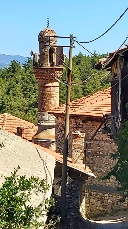 Dar sokaktan yukarı doğru yürüyünce köyün iki camisinden ilki olan Minareli Camii gördük. Köyün en tepesinde bulunuyor. Minare, daha eski tarihli bir yapı. Bir Selçuklu yapısı imajı veriyor. Yapı malzemesi olarak tuğla kullanılmış. Tuğlalı Minare, bir metre yüksekliğindeki küp yapının üzerine oturmakta. Bu küpün yüzeyinde Bizans dönemine ait devşirme mermer parçalar ve kitabeler kullanılmış. Bu emareler ışığında araştırma yapan öğretim görevlileri, bu camiinin ilk yapımını 15yy olarak tarihliyorlar (A.Etlacakuş ve M.Çerkez). Minareyle birlikte yapılan ilk ibadet binası yok olmuş ve daha sonraları başka bir cami binası inşa edilmiş, o ise yıllarca kullanılmayınca bugün harap olmuş vaziyette duruyor. Şu an Camii içine girmemiz mümkün olmuyor ve iç kısmını bir bölümünün resmini açık olan pencerelerden çekiyoruz. En ilginci ise defineciler burayı da es geçmemiş. Minare girişinde basamak olarak kullanılan değirmen taşının altında kasa var diye sökmüşler. Bir başka defineci grupta kendilerini arkeolog olarak tanıtıp caminin öte tarafında kazı yapmışlar. Belki bir başka gelişimizde minarede kalmaz sanırım… Size önerim, camii sokağına girdiğinizden itibaren bu nadide Selçuklu minaresinin fotoğraflarını çekmeye başlayınız. Minarenin şekli, rengi, boyutu o kadar cezbedici ki onun fotoğraflarını çekmeye doyamıyorsunuz.