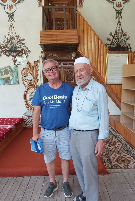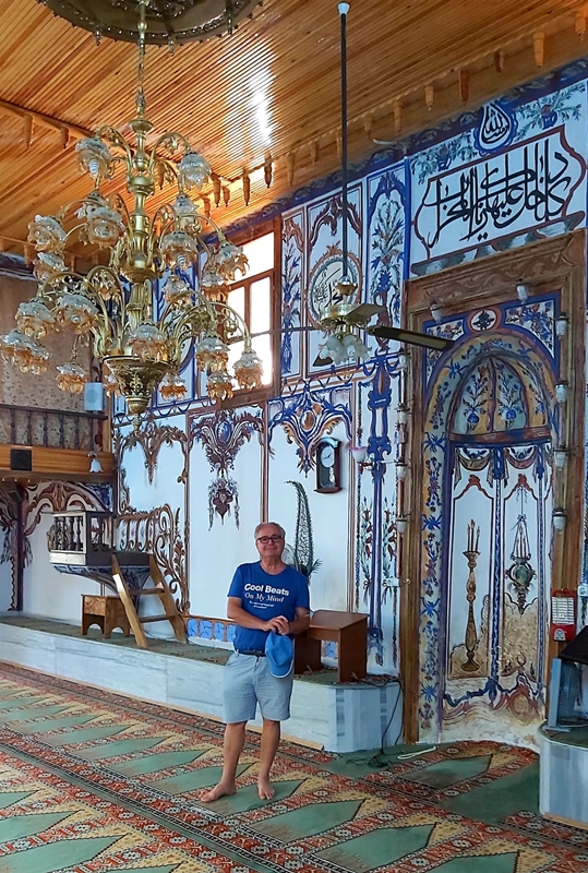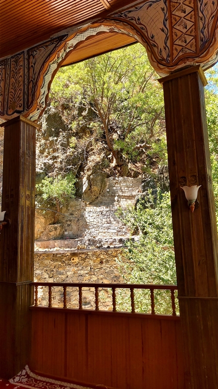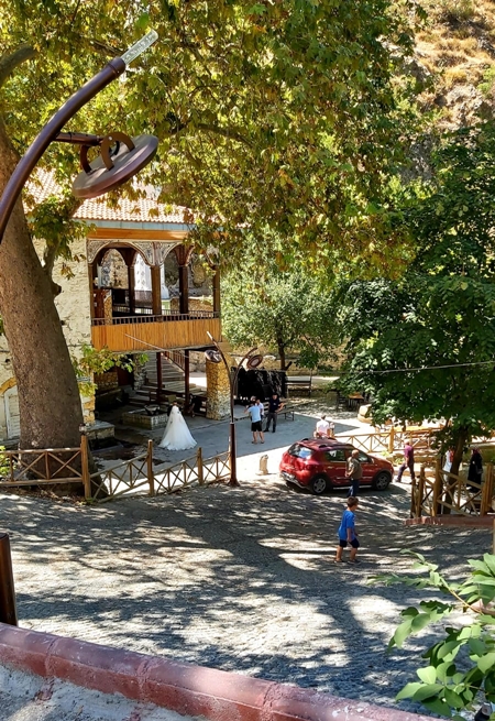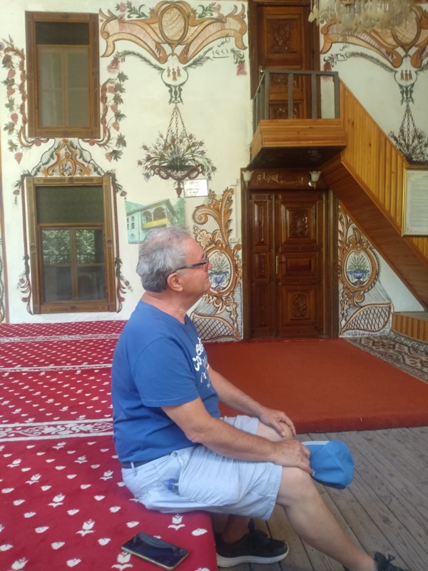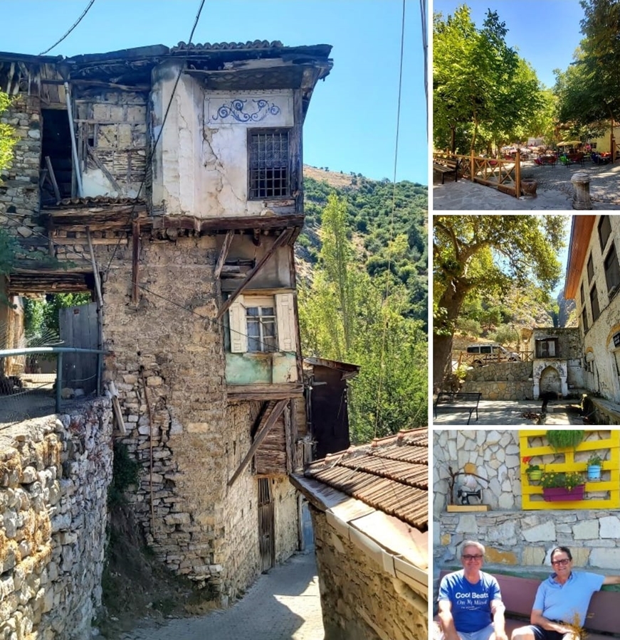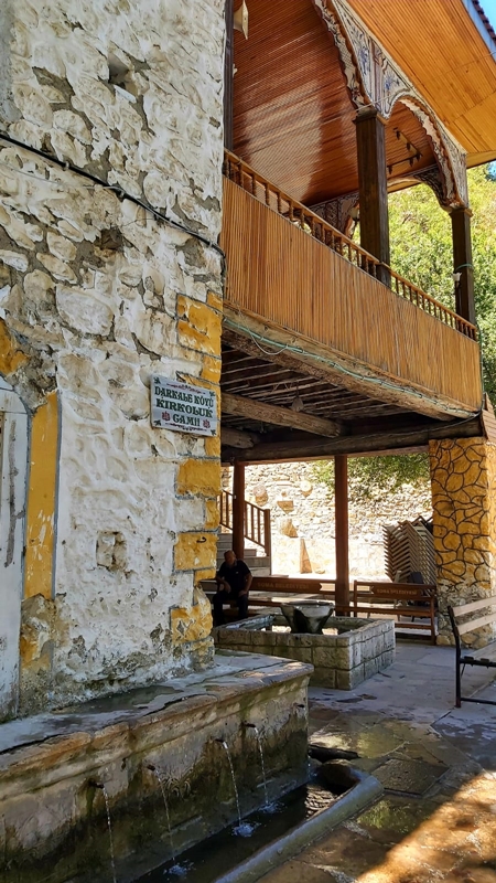 Köyün eski evlerinin arasından aşağı doğru indik. Aşağı kısımda bizi, yaşlı bir çınar ağacı, büyük bir Kafe ve Kırkoluk çeşmesinin üzerine kurulmuş tarihi güzel bir camii karşıladı. Biraz soluklanalım deyip bu Kafede oturalım dedik. Aperatif şeyler ısmarlayıp çayla kendimize geldik. Çınarın gölgesi ve altından esen serinlik yorgunluğumuzu aldı. Aldığımız bilgiye göre Soma halkı yaz akşamlarını bu serin atmosferde geçiriyormuş. Hizmet gece ikilere, üçlere kadar sürüyormuş. Sakin ve dingin bir mekân, çalışan genç kızlarımız iyi niyetli ve sevecenler.