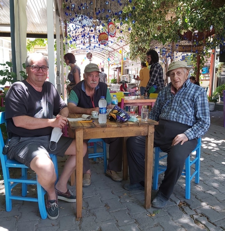 Bir başka sokağa daldığımda üç yol ağzında sandalyede oturan Tahsin amcayla tanıştım. Oradaki hava sirkülasyonu onun için klima vazifesi görüyor. Uzun boylu, esmer tenli bir amca. Selam verip tanışınca eskilere dalıp anlatmaya başladı: “Bu köyde doğdum. Hep burada yaşıyorum. Eskiden nohut, tütün ekerdim, zeytine giderdim, bana yeterdi. Bu köyde tam 5 tane yağhane vardı. Hepsi 2 vardiye çalışıp vatandaşın işini çabucak görmek isterlerdi. Şimdi halk, toplanan zeytini sattığı için 2 tane kaldı. Bak şu karşıki incir ağaçları benim. Meyveleri olgun olsaydı, sizlere incir verirdim” dedi. Yurdum insanı, biraz sohbetten sonra gönlünü size açıveriyor. Bunu ben her yerde yaşıyorum. Biraz önce de avluda toplanan hanımlar da, selam verince bizi çay içmeye davet etmişlerdi. Çok yaşasınlar.