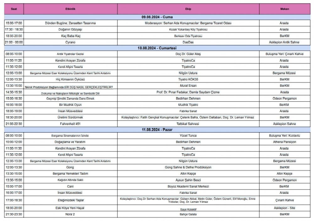 T.C. Kültür ve Turizm Bakanlığı, İzmir Büyükşehir ve Bergama Belediyesi katkıları, BERKSAV (Bergama Kültür ve Sanat Vakfı), Bergama Ticaret Odası ve Ne Yerde Ne Gökte Derneği’nin destekleriyle 9-11 Ağustos tarihleri arasında düzenlenecek 5. Bergama Tiyatro Festivali boyunca kamusal alanda katılımcılarla ücretsiz olarak buluşacak pek çok etkinliğin yanı sıra; “Cyrano”, “Fahrenheit 451” ve “Eski Köye Yeni Hayal/Old Village New Dream” performansları ile “Bergama Yemekleri Tadım”, “Antik Tiyatrolar Gezisi”, “Teknik Prodüksiyon Bağlamında Bir Düz Nasıl Gerçekleştirilir?”, “Bergama Sinemalarının İzinde”, “Doğaçlama ve Yaratım” ve “Kağıdın Altında Saklı” etkinliklerinin biletlerine Mobilet üzerinden ulaşılabiliyor.