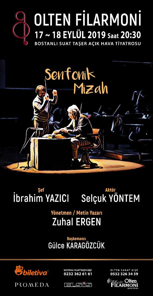 Konser sahnesi ile tiyatro sahnesini bir arada sunan “Senfonik Mizah” İzmirli sanatseverlerden gelen yoğun istek üzerine yeniden İzmir’de izleyici ile buluşuyor. Usta oyuncu Selçuk Yöntem ve ünlü orkestra şefi İbrahim Yazıcı’nın Olten Filarmoni Orkestrası eşliğinde prömiyerini geçtiğimiz yıl Ahmed Adnan Saygun Sanat Merkezi’nde gerçekleştirdikleri ve izleyiciden tam not alan gösteri 17-18 Eylül tarihlerinde Bostanlı Suat Taşer Tiyatrosu’nda yeniden sahne alacak.