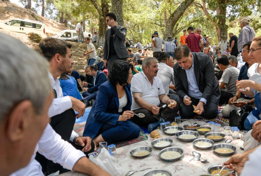 Başkan Tugay, toplantının ardından Kınık Belediye Başkanı Sema Bodur ile Örtülü Köyü’ne geçerek bölge sakinlerinin verdiği geleneksel köy hayrına katıldı. Köylülerle bir araya gelen Tugay, kazanların başına geçip yemek dağıttı. Tugay, duaların okunduğu köy hayrında yurttaşlarla yemek yedi.