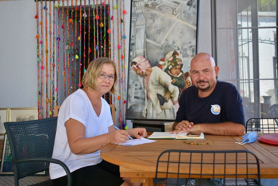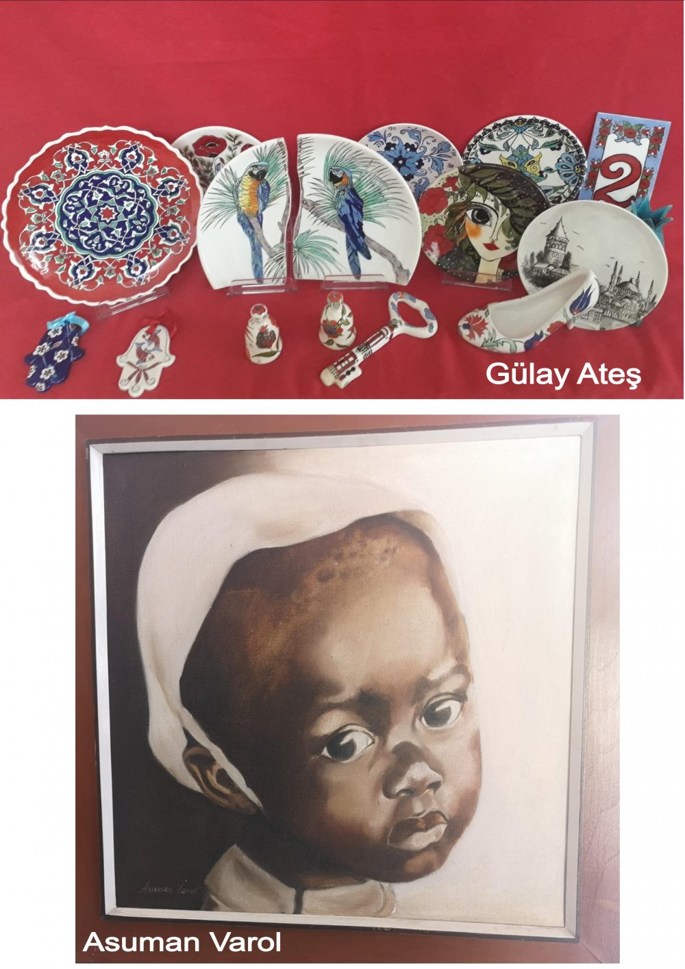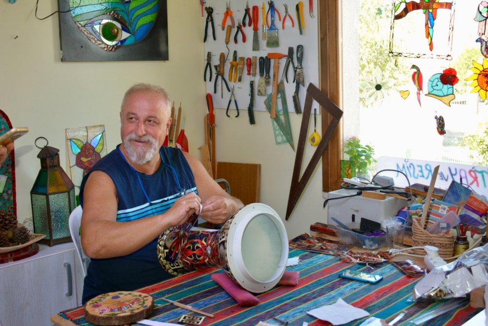 Asuman Varol gezimiz sırasında bizi öyle sıcak kanlı insanlarla tanıştırdı ki zamanın nasıl geçtiğini anlayamadık. Vitray Atölyem Sanat Evi’ne konuk olduk. Vitray sanatçısı Emine Tüysüz’ün açtığı bu atölye de bizi Mustafa ve Gülay Ateş çifti karşıladı. Keyifli bir sohbet ortamı oluştu. Emine Tüysüz, Sanat Köyü Projesini duyduğunda çok mutlu olmuş ve 5 yıl önce Küçükköy’e taşınma kararı almış. Aynı atölye de Mustafa Ateş ve Gülay Ateşle bir birinden değerli eserler üretmeye başlamışlar. Gülay Ateş hem çini sanatçısı hem de vitray çalışmalarıyla Emine Tüysüz’ün emektaşı. Mustafa Ateş ise başta darbuka olmak üzere vurmalı çalgılara renk katan çok yönlü bir sanatçı. İznik Mozaik ekolü ile darbukaları kendi tasarımlarıyla desenler işliyor ve bir çok yerden de sipariş alıyor. Misafir olduğumuz bu kısa süre de bizlere küçük bir resitalde sunmuş oldu.