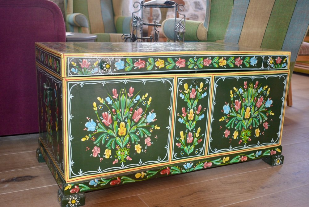 Gezimize yeni yeni açılmakta olan bir sanat evinde ara verdik. Bizi ağırlayan Asuman Varol, İstanbullu bir ressam. Daha önce Dikili’de de 25 yıl yaşamış olan Asuman Hanım, çalışmalarını ve atölyesini bize tanıtırken bize hiç yabancı gelmeyen bir eserle karşılaştık. Dikili’de uzun yıllar at arabaları yapan ve onları süsleyen Tevfik Gülcüler ustamızın ellerinde hayat bulmuş bir sandıktı bu. Yıllar önce Tevfik usta, Asuman Varol’a hediye etmiş bu güzel eseri.