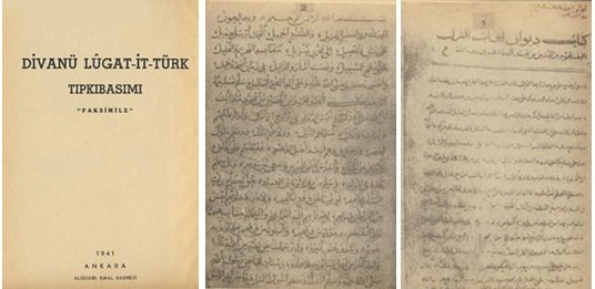 Fotoğraf 10-12. Divanu Lugati’t-Türk yazmasının eldeki tek örneğinin tıpkıbasımı. Kapak ile 1. ve 2. sayfaları. Alaattin Kral Basımevi, Ankara, 1941. https://tr.wikisource.org/wiki/Dosya:D%C3%AEv%C3%A2n%C3%BC_Lug%C3%A2ti%27t-T%C3%BCrk_t%C4%B1pk%C4%B1bas%C4%B1m.pdf