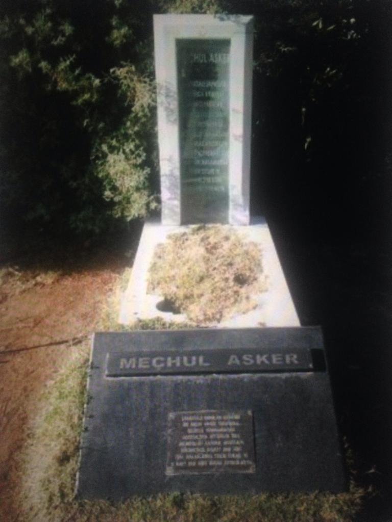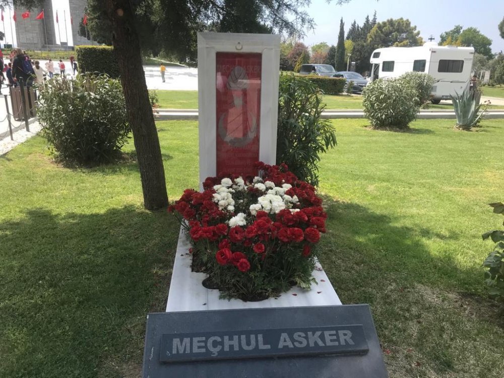 Meraklı adımlarla hızla mezara gidiyoruz ve bizi bir sürpriz karşılıyor. Mezarın başındaki tanıtım yazısından, 'MEÇHUL ASKER' başlığı altında,